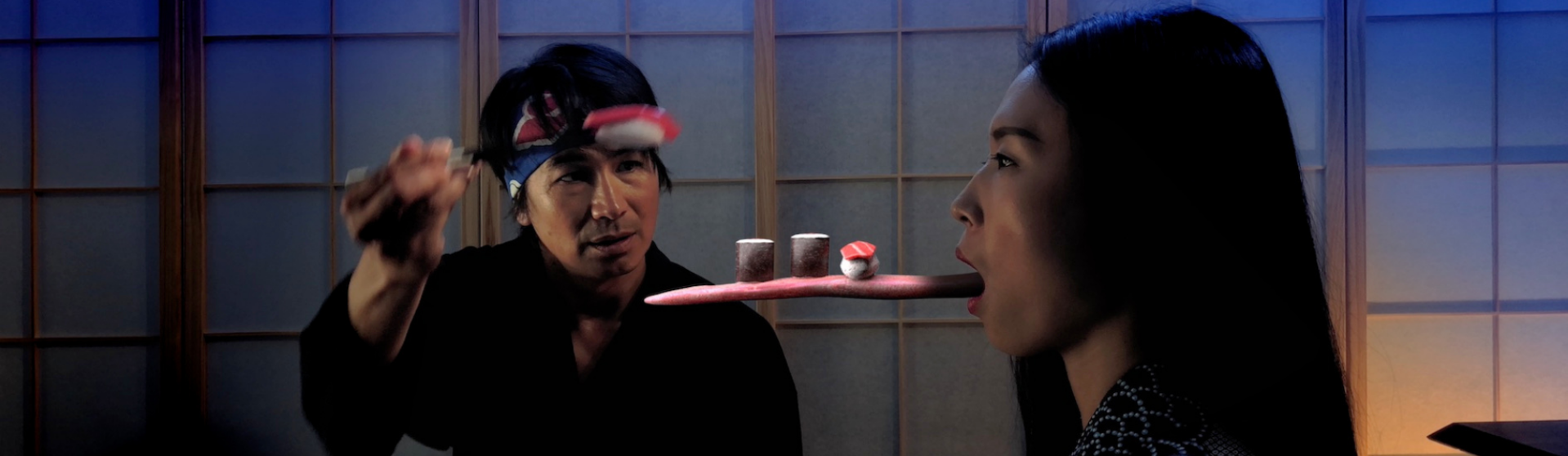 Yoshizumi Nagaya, a Japanese sushi chef, sits at his table at home in the evening. It is raining cats and dogs. Suddenly someone knocks at the door and there is a petite young woman.