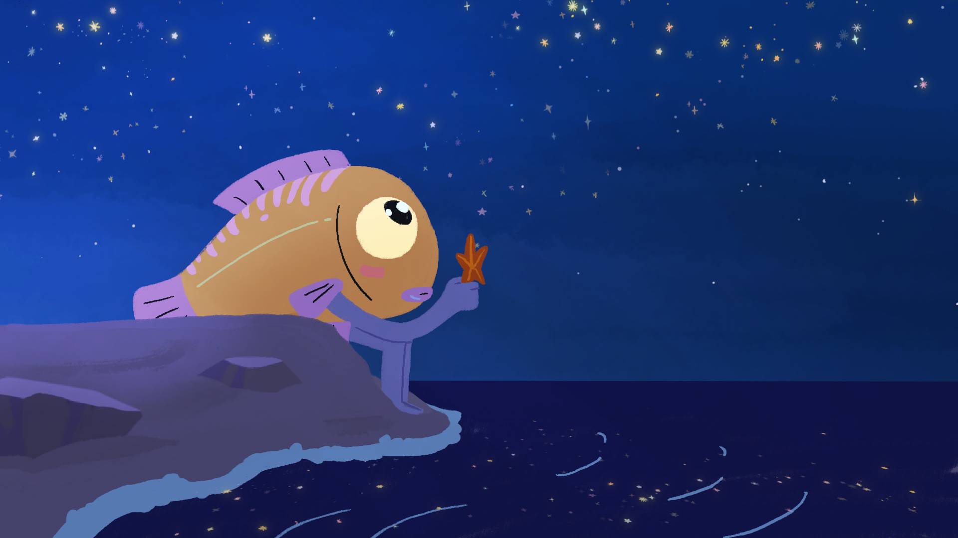 Esther regarde le ciel à travers un télescope. À côté d’elle, une créature mi-humaine mi-poisson tente d’attirer son attention, en vain. Mais qu’est-ce que ces étoiles ont de si intéressant ?
